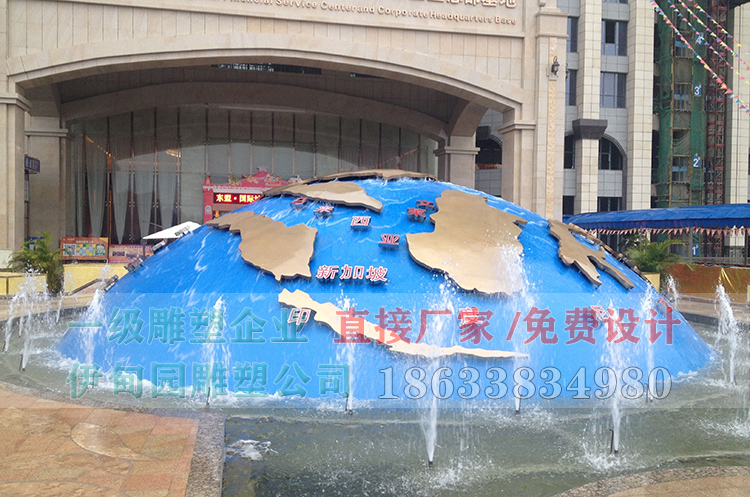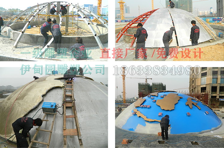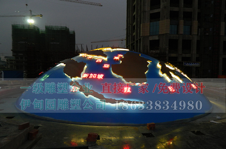 半個不銹鋼地球儀直徑11米,安裝于廣西省崇左市某單位門口。不銹鋼雕塑采用鍛造工藝技術(shù),內(nèi)部鋼結(jié)構(gòu)支撐,內(nèi)置燈光,整體焊接、白天自有景觀雕塑夜晚又是一奇景,帶有時尚的現(xiàn)代景觀感。