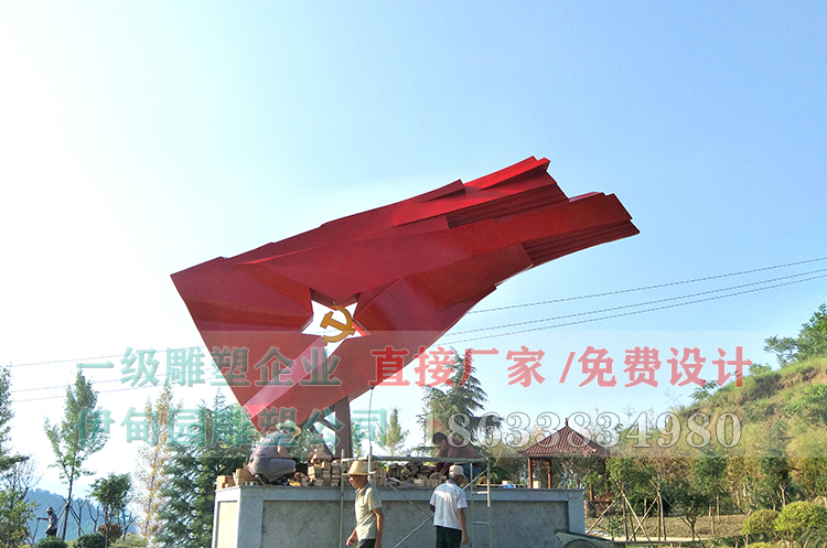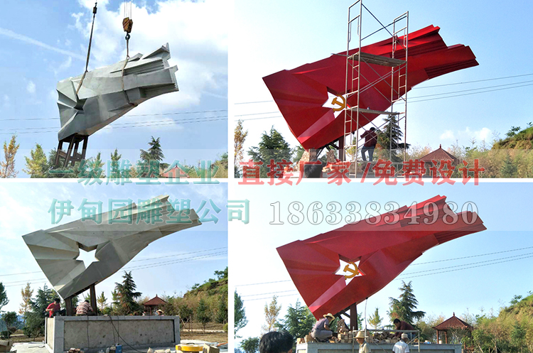 不銹鋼黨旗雕塑尺寸:長7.2x高5.5m,安裝于河南省某公園。制作工藝流程:小稿打印→圓管放樣→鍍鋅骨架→板材鍛造→造型拼接→焊接打磨→環(huán)氧底漆→氟碳面漆→運輸安裝。