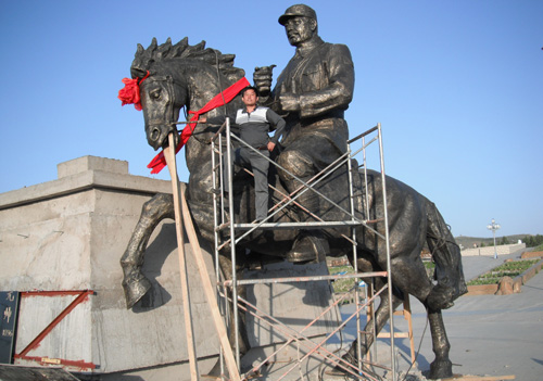 人物雕塑制作完成后,根據(jù)其材料(紅銅、黃銅)的不同性質(zhì),選擇合適的方法進(jìn)行表面處理。如:紅銅的清洗,首先需要用稀釋的硫酸液將紅銅表面進(jìn)行刷洗,除去人物雕塑表面的油污、銹垢,然后用自來水沖洗掉具有腐蝕性的稀硫酸,這樣就可以為人物雕塑進(jìn)行表面著色。先將化學(xué)藥劑倒入玻璃容器中,然后用干凈的毛刷將化學(xué)藥水涂刷在人物雕塑表面進(jìn)行化學(xué)腐蝕,稍后等色彩附著在雕塑表面后,用銅刷拋刷,其后用清水洗凈擦干,上光、打蠟、保護(hù)其表面,最終完成人物雕塑制作。