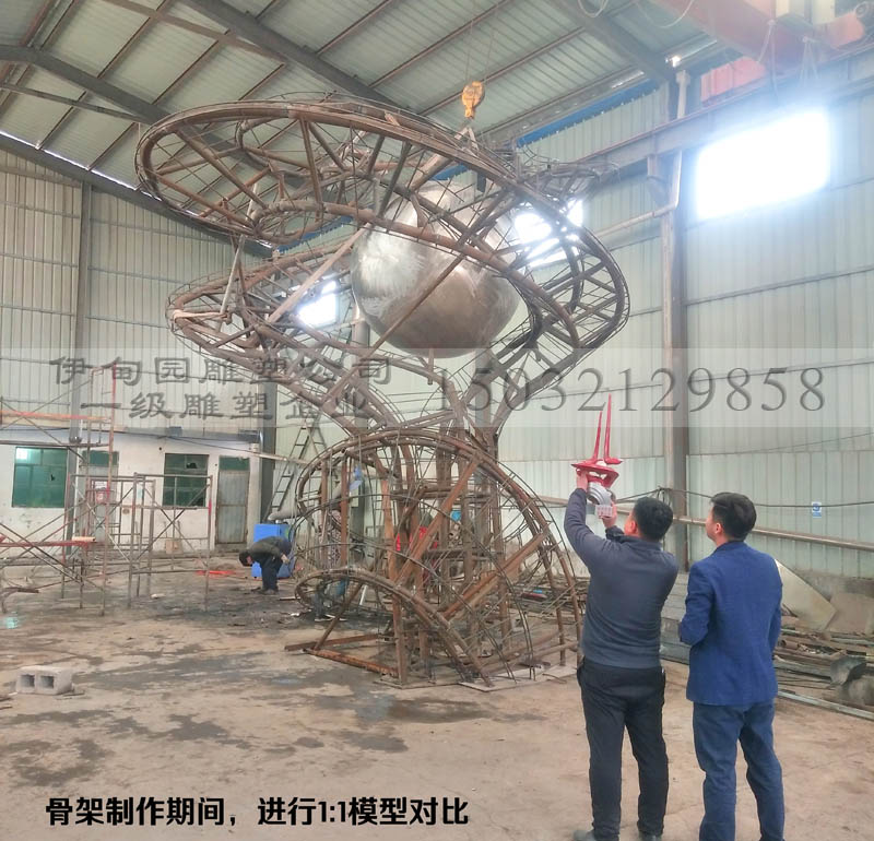 1、根據(jù)雕塑模型按比例核算到所需高度,雕塑內(nèi)骨架的規(guī)格采用槽鋼、管材和角鋼從底往上,由粗變細(xì)、由密而疏焊成方籠。