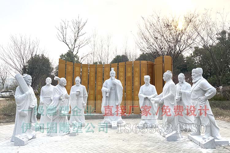 淮南子雕塑,采用花崗巖材質(zhì)雕刻制作,人物為:蘇飛、李尚、左吳、田由、劉安、雷被、毛被、伍被、晉昌。雕塑講述的是淮南王和八公,縱論天下興亡,探討治世良方,醉心學(xué)術(shù)方技,倡揚思維創(chuàng)新。在中國古代思想和科技史上,具有獨特的地位。