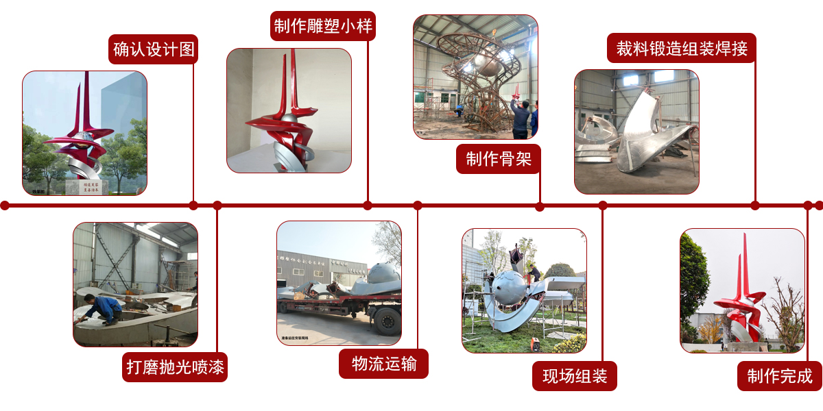 丹鳳朝陽雕塑(又稱鳳凰不銹鋼雕塑),高7.5米,長7米,不銹鋼304材質(zhì)制作,安裝于遼寧省某城市廣場。鳳凰不銹鋼雕塑制作流程:確認設(shè)計圖→制作雕塑骨架→裁料鍛造→組裝焊接→打磨拋光→物流運輸→現(xiàn)場組裝→噴漆整形。